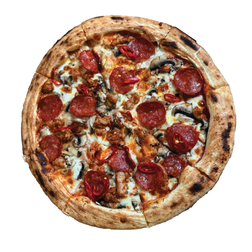 Blat, sos de roșii, condiment (busuioc și piper), mozzarella, salam picant, carne tocată de porc și vită, ardei iute ți ciuperci.