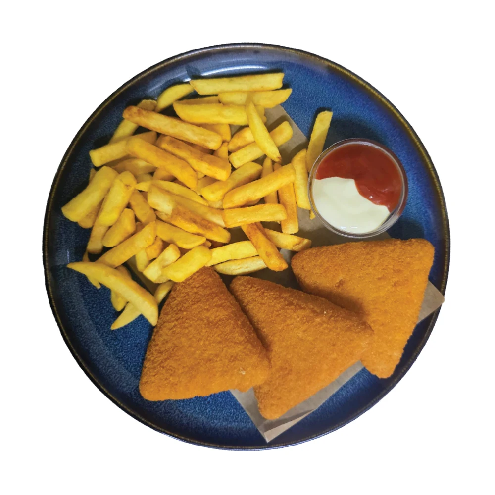 Mozzarella în pane, cartofi pai, ketchup și maioneză .
