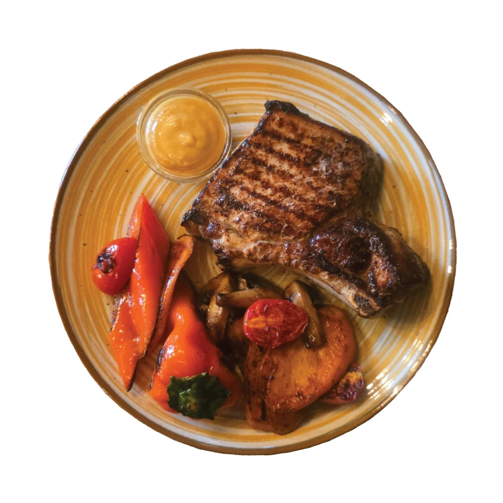 Steack de porc, ardei gras, morcov, roșii cherry, ciuperci, sos muștar.
